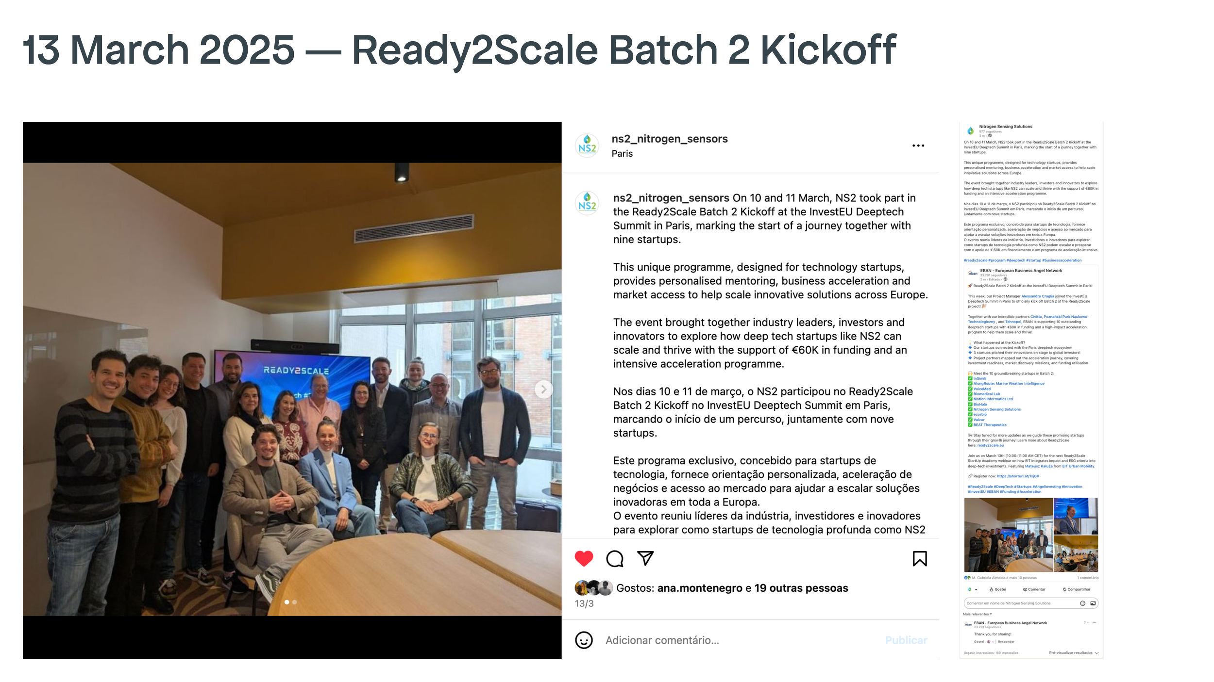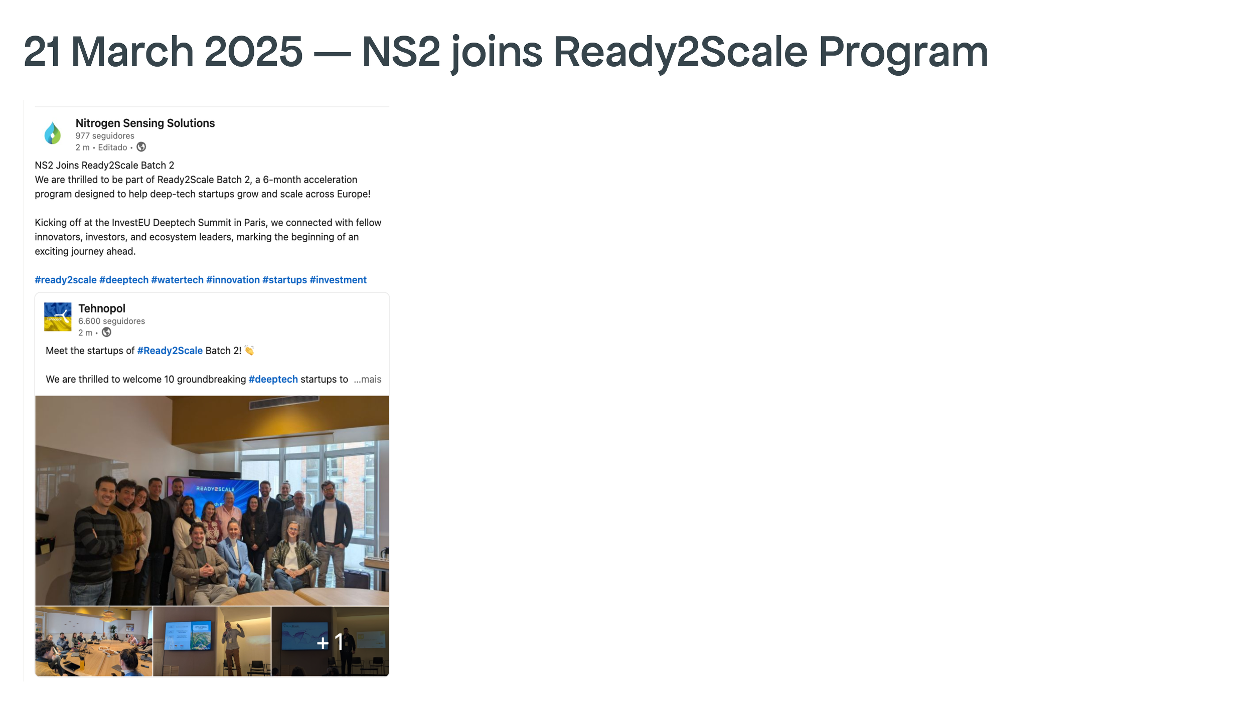 Selected as one of just 10 European startups from over 300 applications, NS2 joined Batch 2 of Ready2Scale, receiving financial and strategic support to advance our mission of delivering innovative biosensing solutions for water monitoring and management.